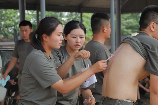 圖為陸軍第82集團(tuán)軍“鐵軍旅”“模范衛(wèi)生隊(duì)”為官兵巡診擦藥。楊仕偉 攝