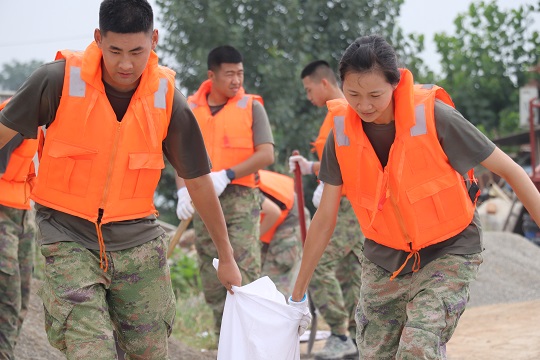 圖為陸軍第82集團(tuán)軍“鐵軍旅”女兵在大清河天津靜海段裝填沙袋加固堤壩。楊仕偉 攝