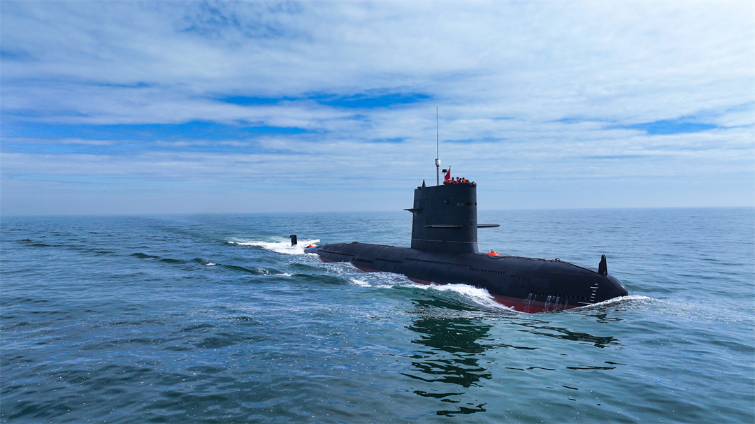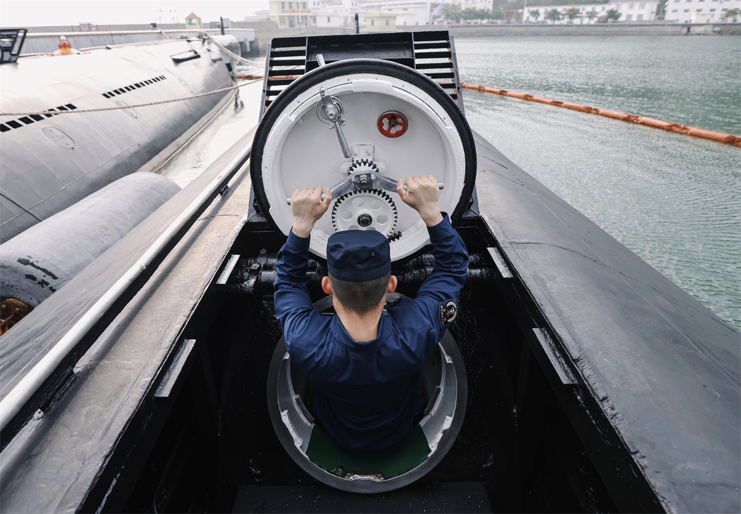 圖為潛艇遠(yuǎn)航歸來,艦橋值更人員行舉手禮。