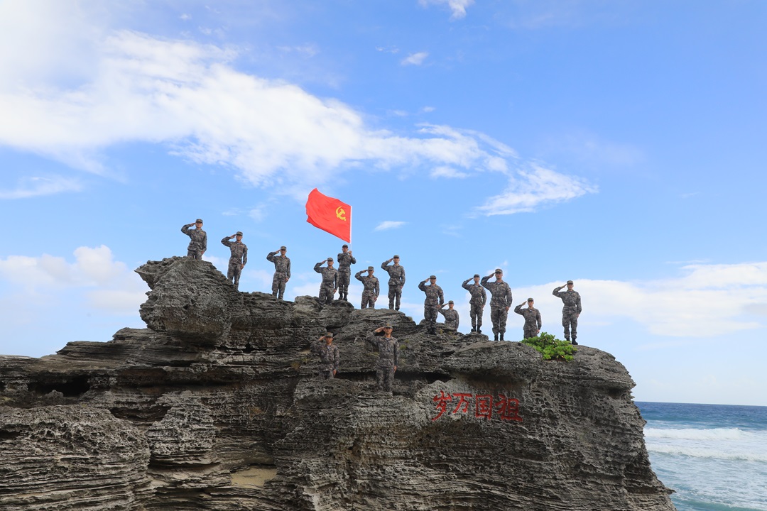 清晨,站在中建島瞭望哨上,一面巨幅黨旗和國旗,以及“祖國萬歲”“黨徽永耀”8個大字躍入眼簾。這幅畫卷是官兵們用島上特有的植物——海馬草種植出來的。這8個字,是島上官兵的信仰旗幟和精神豐碑。同時,海馬草具有很好的固水、固沙作用,也為防止島上水土流失,建設(shè)綠色海島起到重要作用。