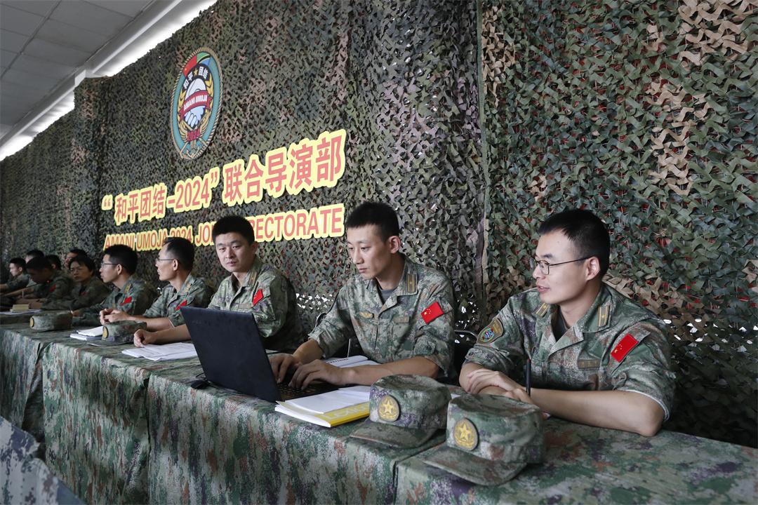 “××鎮(zhèn)周圍發(fā)生恐怖襲擊,請迅速處置……”當(dāng)?shù)貢r間8月4日下午,在坦桑尼亞馬坪加綜合訓(xùn)練中心的“和平團結(jié)-2024”演習(xí)聯(lián)合指揮部內(nèi),中坦兩軍參演部隊正在緊鑼密鼓組織聯(lián)合作戰(zhàn)籌劃。隨著一條條情報信息匯集至指揮信息系統(tǒng),恐怖分子活動態(tài)勢逐漸明朗,各編組依案提出處置建議。