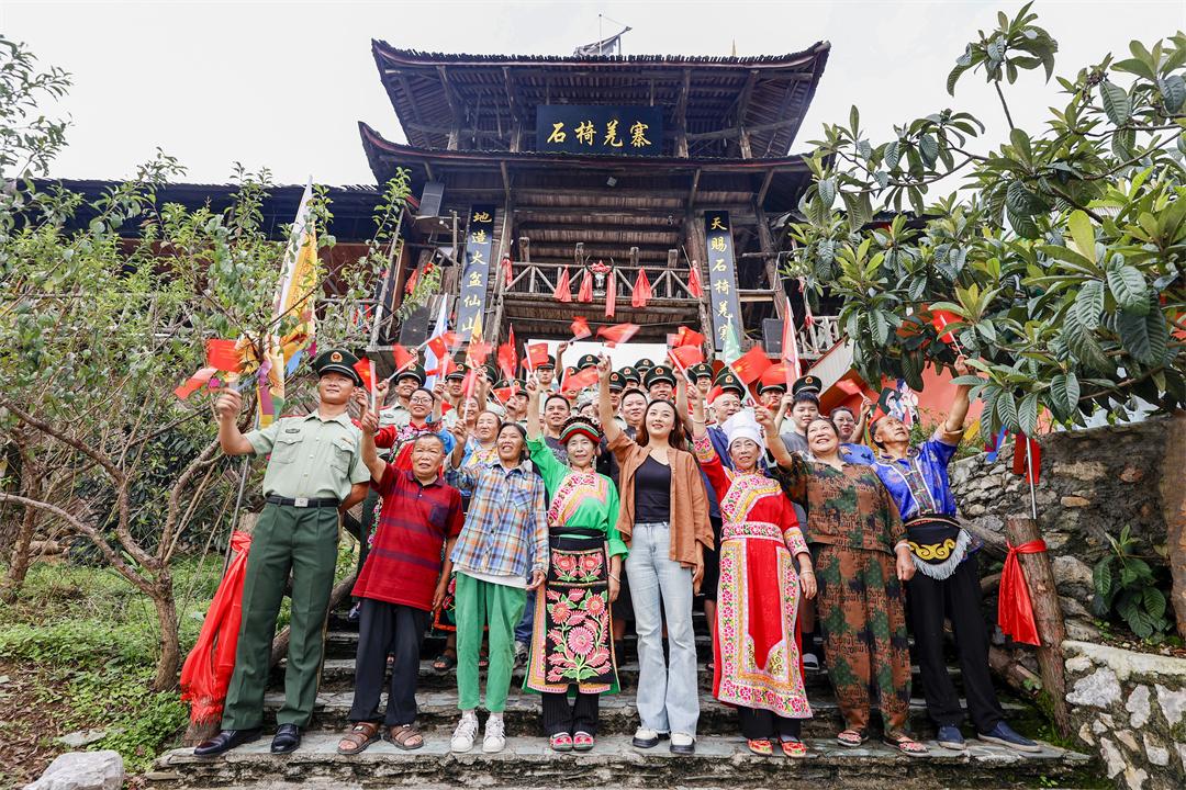 圖為武警北川中隊官兵與北川羌族人民在石椅羌寨合影留念。