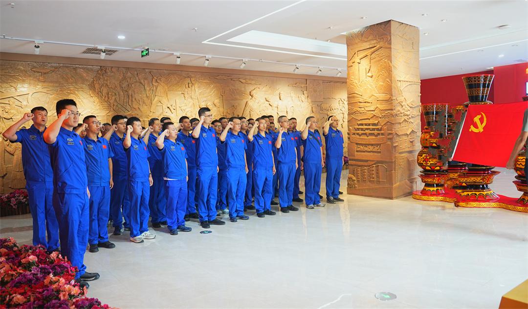 “我宣誓!我志愿加入中國共產(chǎn)黨……”在展廳,技術(shù)部黨員重溫入黨誓詞。全體黨員面對鮮紅的黨旗,莊重舉拳宣誓。錚錚誓言激勵著全體黨員在新征程上加壓奮進(jìn),堅定向著建設(shè)世界一流航天發(fā)射場目標(biāo)砥礪前行。