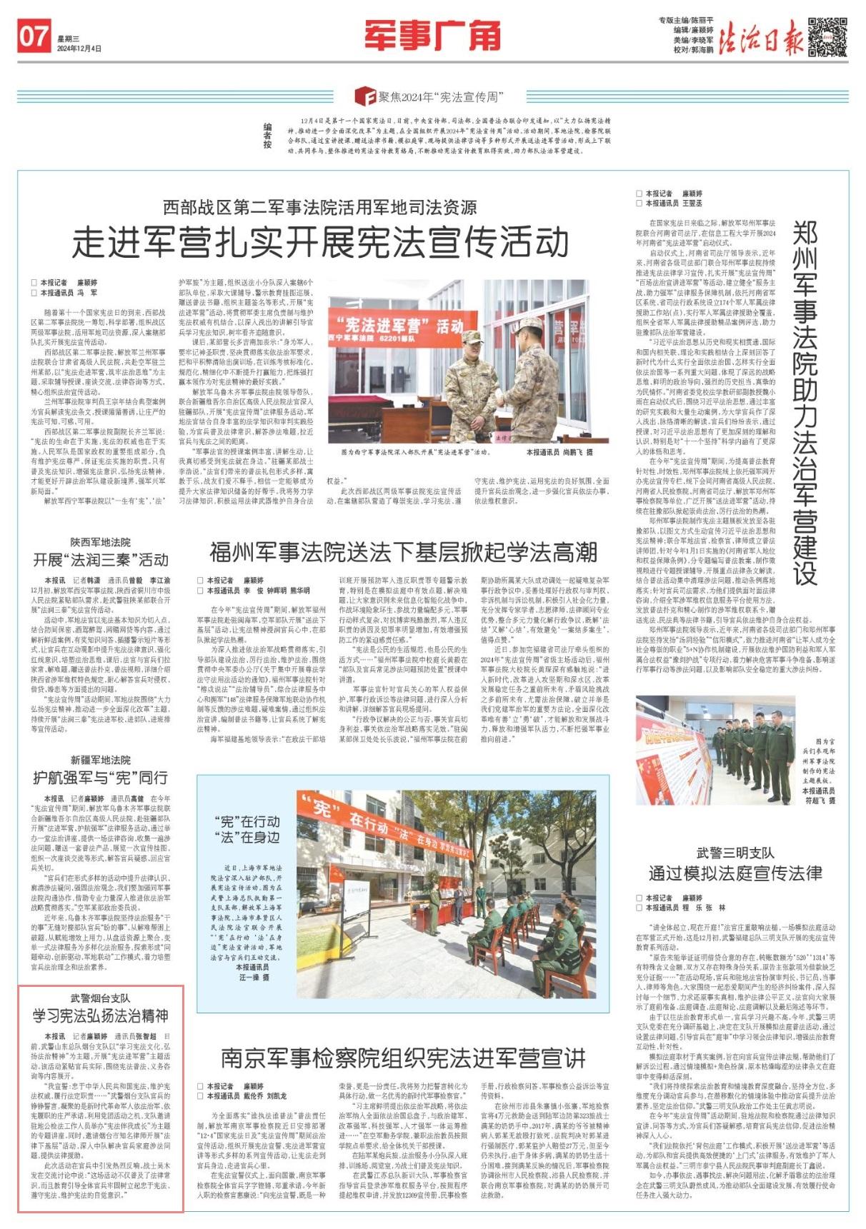 日前,武警山東總隊煙臺支隊以“學習憲法文化,弘揚法治精神”為主題,開展“憲法進軍營”主題活動。該活動緊貼官兵實際,圍繞憲法普法、義務咨詢等內(nèi)容展開。