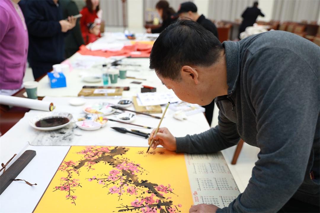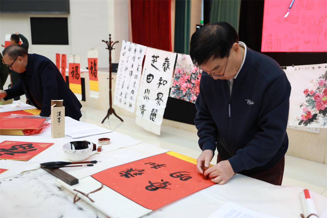 活動現(xiàn)場,書畫家們揮毫潑墨,將新春祝福和美好祝愿凝聚筆端,送到軍嫂軍娃和官兵代表手中,翰墨飄香中交織著歡聲笑語。壓紙、蘸墨、起筆、收筆,一起一落間,一張張蒼勁有力、筆走龍蛇的“?!弊周S然紙上,一幅幅濃墨重彩、寓意吉祥的“花開富貴”圖栩栩如生。禮堂里人頭攢動,大家簇?fù)碓跁ㄋ囆g(shù)家們身邊,看著他們的作品嘖嘖稱贊。