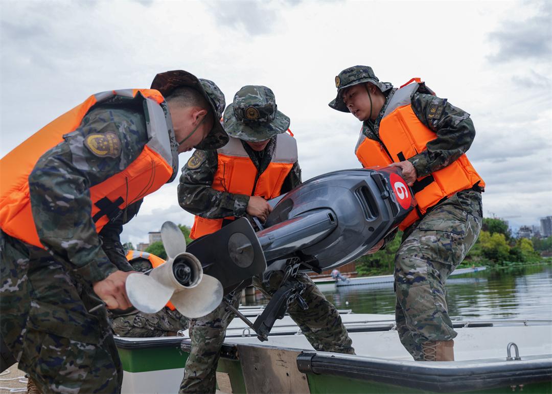 圖為武警官兵開展訓練前安裝舟艇發(fā)動機。歐家程 攝