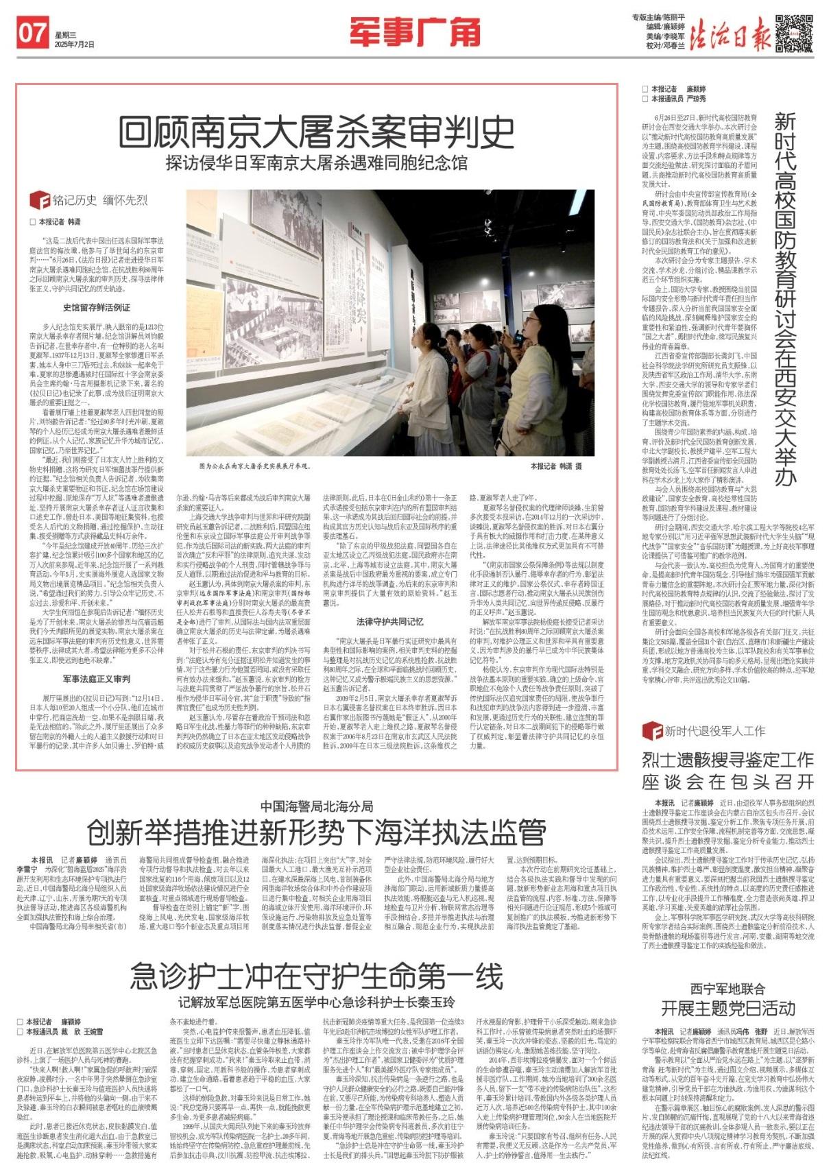 解放軍南京軍事法院楊俊庭長(zhǎng)接受記者采訪時(shí)說(shuō):“在抗戰(zhàn)勝利80周年之際回顧南京大屠殺案的審判,對(duì)維護(hù)公理正義和世界和平具有重要意義,因?yàn)閷徟猩婕暗谋┬性缫殉蔀橹腥A民族集體記憶符號(hào)。”