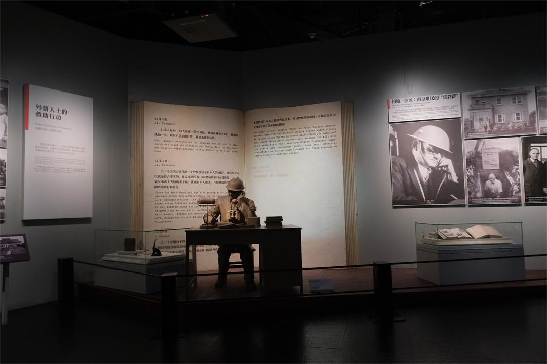 展廳里展出的《拉貝日記》寫到:“12月14日,日本人每10至20人組成一個(gè)小分隊(duì),他們?cè)诔鞘兄写┬?,把商店洗劫一空。如果不是親眼目睹,我是無(wú)法相信的?!背酥?,展廳里還展出了眾多留在南京的外籍人士的人道主義救援行動(dòng)和對(duì)日軍暴行的記錄,其中許多人如貝德士、羅伯特·威爾遜、約翰·馬吉等后來(lái)都成為戰(zhàn)后審判南京大屠殺案的重要證人。