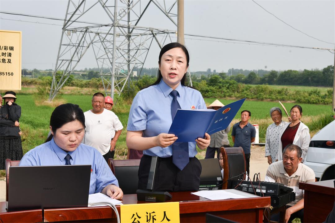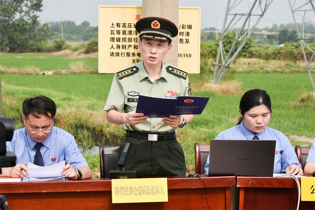 7月15日,解放軍南京軍事檢察院協(xié)同淮安市盱眙縣人民檢察院,對(duì)一起過(guò)失損壞軍事通信案提起刑事附帶民事公益訴訟,并在案發(fā)地盱眙縣馬壩鎮(zhèn)一處農(nóng)田間公開(kāi)開(kāi)庭審理。盱眙縣人民檢察院檢察長(zhǎng)潘凌云作為公訴人出庭指控犯罪,南京軍事檢察院大校檢察長(zhǎng)劉劍作為附帶民事公益訴訟起訴人出庭提起民事公益訴訟,盱眙縣人民法院院長(zhǎng)田庚擔(dān)任審判長(zhǎng)。為加大案件警示教育效果,庭審邀請(qǐng)全國(guó)人大代表、江蘇省人大代表、部隊(duì)有關(guān)人員,以及案發(fā)地附近村民100余人參與旁聽(tīng)。