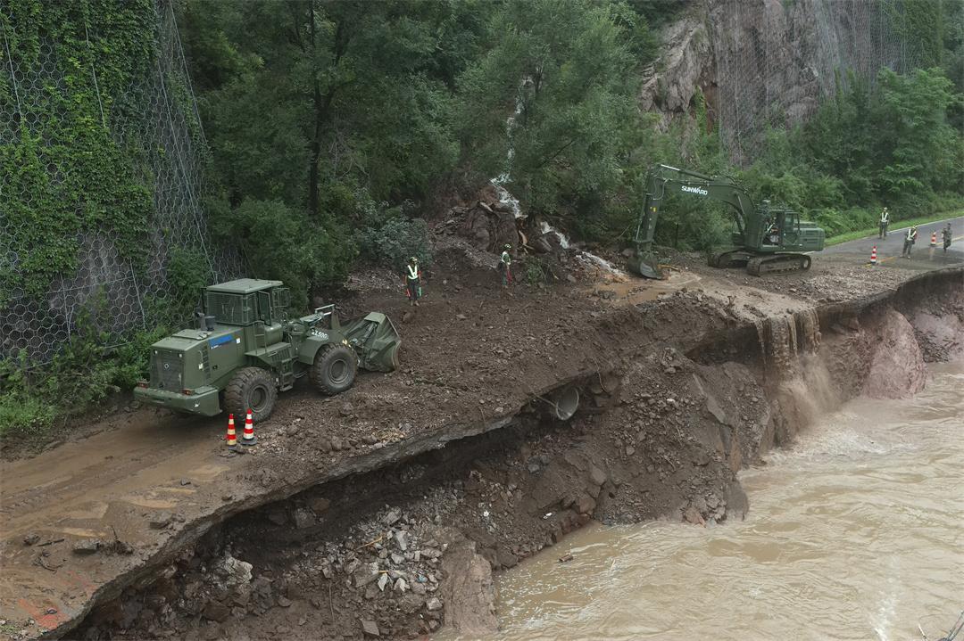 山洪造成多處道路中斷,人員車輛無(wú)法通行,武警官兵采取人歇機(jī)不歇的方式連夜搶通道路。