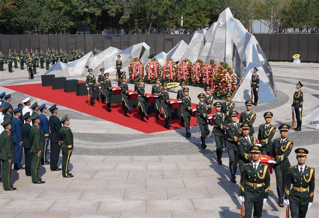 9月13日10時,安葬儀式開始。陵園下沉式紀念廣場環(huán)形烈士英名墻下,擺滿黃白相間的菊花,參加儀式的人們肅穆站立。軍樂隊奏響婉轉(zhuǎn)低回的《思念曲》,在解放軍儀仗司禮大隊官兵持槍護衛(wèi)下,禮兵們邁著整齊的步伐,護送志愿軍烈士遺骸棺槨緩步進入紀念廣場,全場奏唱中華人民共和國國歌。