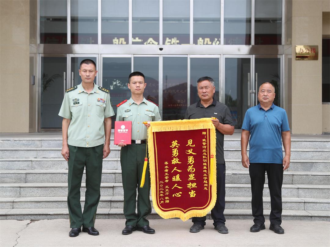 “感謝王守超同志救了我們兩個(gè)人,拯救了兩個(gè)家庭,武警戰(zhàn)士好樣的!”不久前,河南省濮陽市范縣龍王莊鎮(zhèn)孟樓村村民王正方一行來到武警河北總隊(duì)訓(xùn)練基地,將一面繡著“見義勇為顯擔(dān)當(dāng) 英勇救人暖人心”的錦旗,以及范縣見義勇為評(píng)定委員會(huì)頒發(fā)的“見義勇為先進(jìn)個(gè)人”證書,鄭重遞到該基地王守超手中。