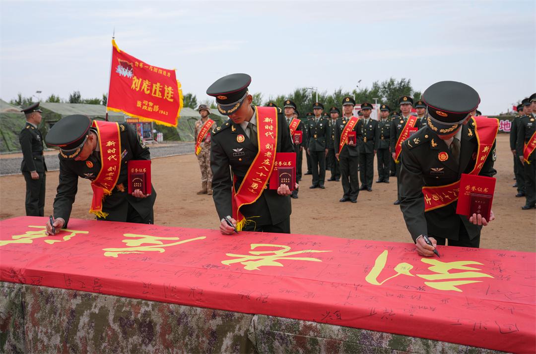 圖為陸軍第82集團軍某旅“劉老莊連”舉行“新時代劉老莊八十二勇士”頒授儀式,這是官兵在勇士旗上簽名。張永進 攝
