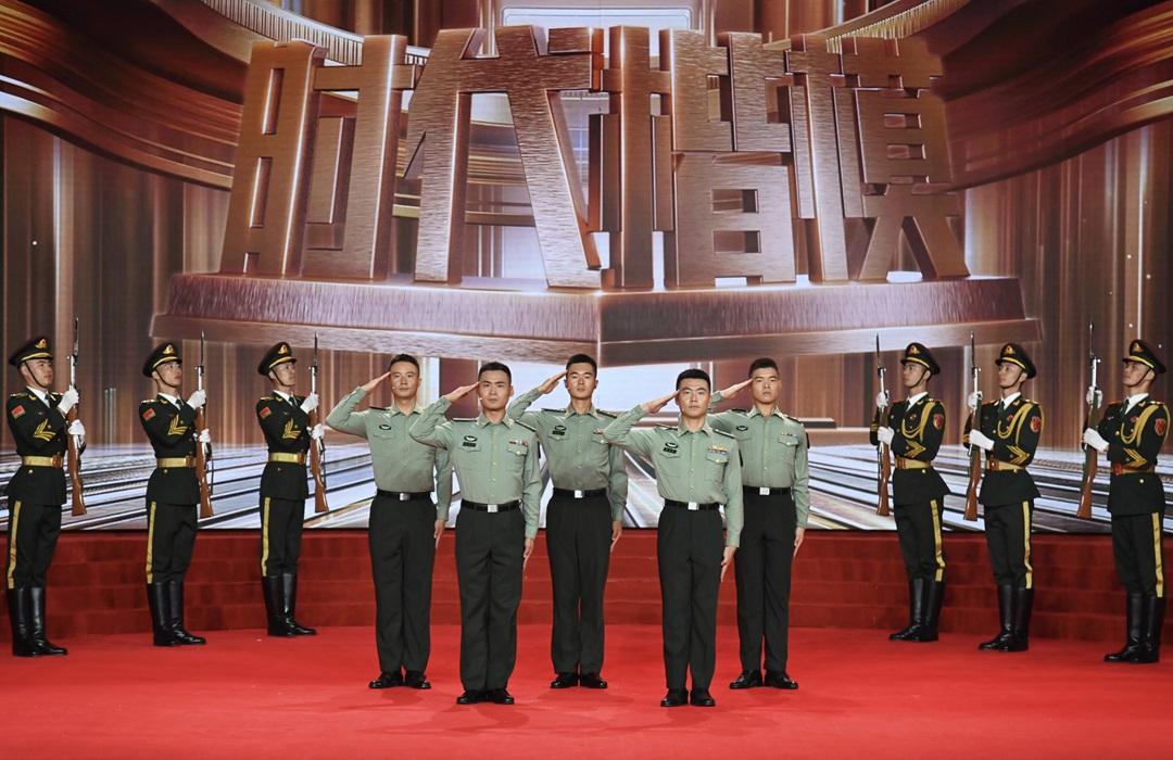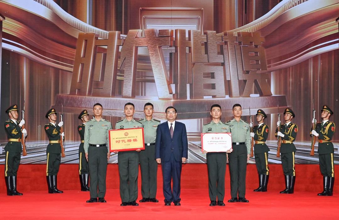 圖為在“時代楷模”發(fā)布儀式上,陸軍第八十二集團(tuán)軍某旅“劉老莊連”官兵代表領(lǐng)取“時代楷?!豹勁坪妥C書。張永進(jìn) 攝