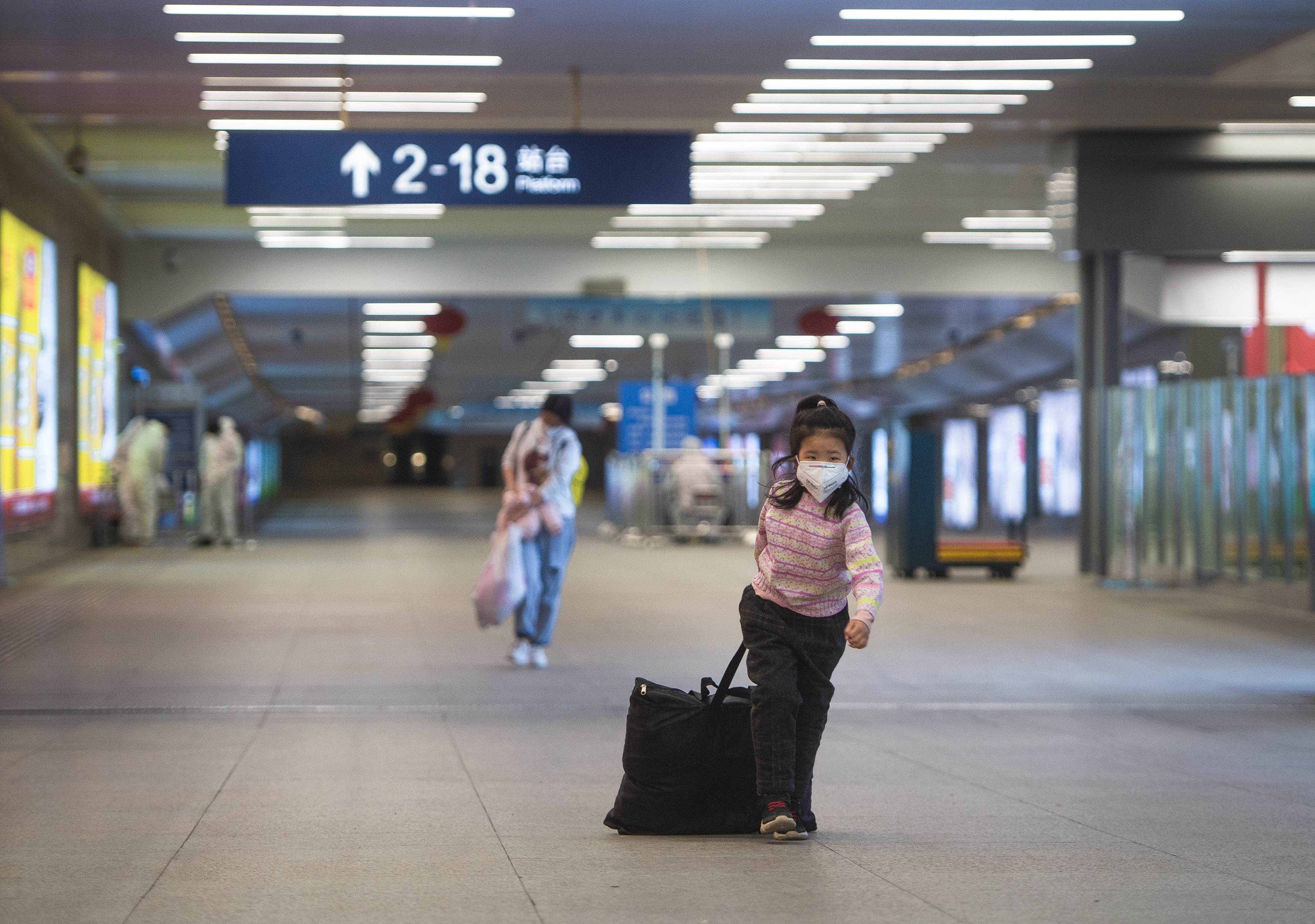 武漢恢復(fù)鐵路客站到達業(yè)務(wù)當(dāng)天,在武漢漢口火車站,一名小女孩拉著行李走在家長的前面(3月28日攝)。