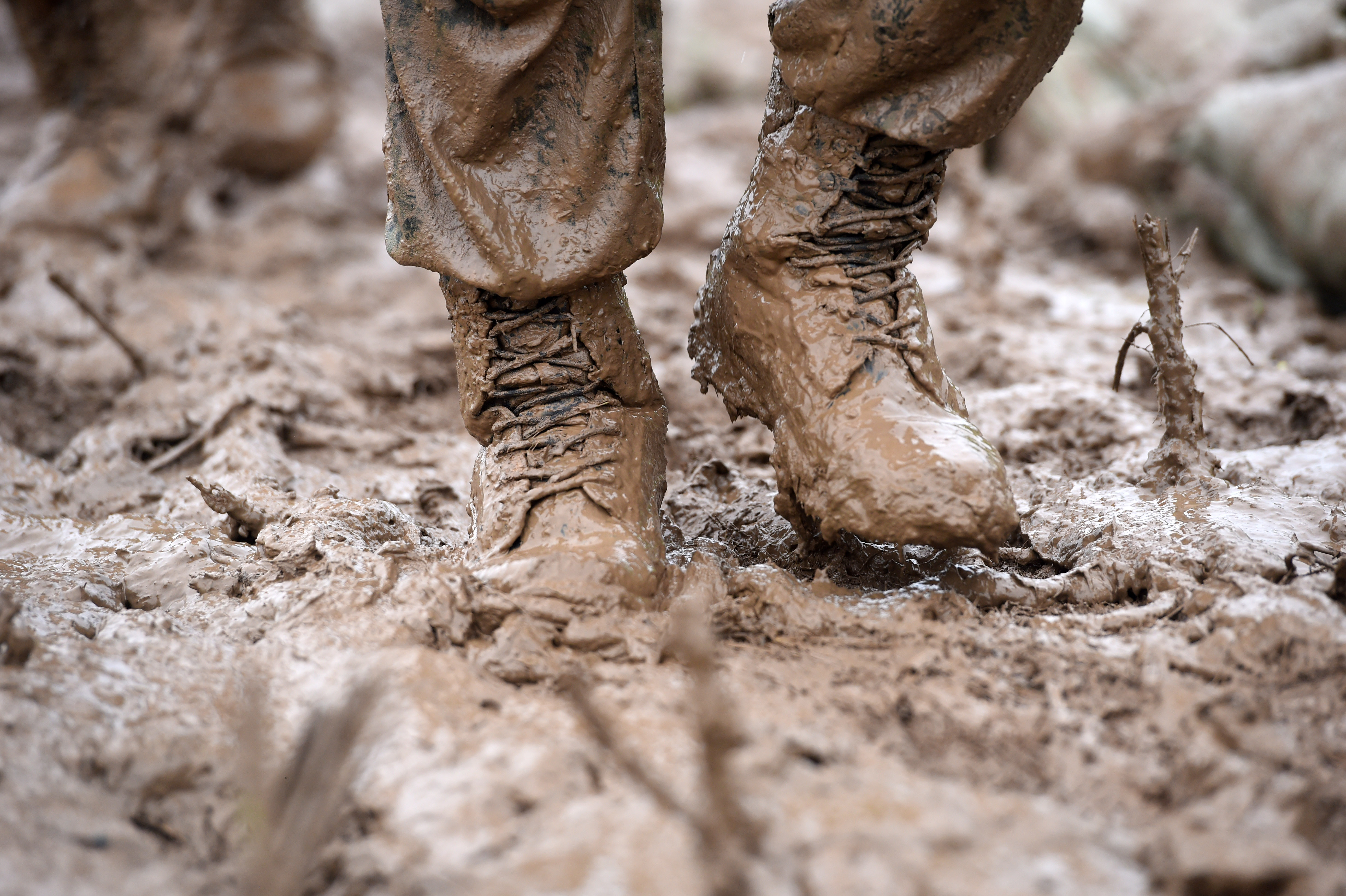7月18日,武警安徽總隊馬鞍山支隊的戰(zhàn)士搬運沙袋行走在和縣黃壩村的石跋河堤壩上,泥水裹滿褲腿和鞋。