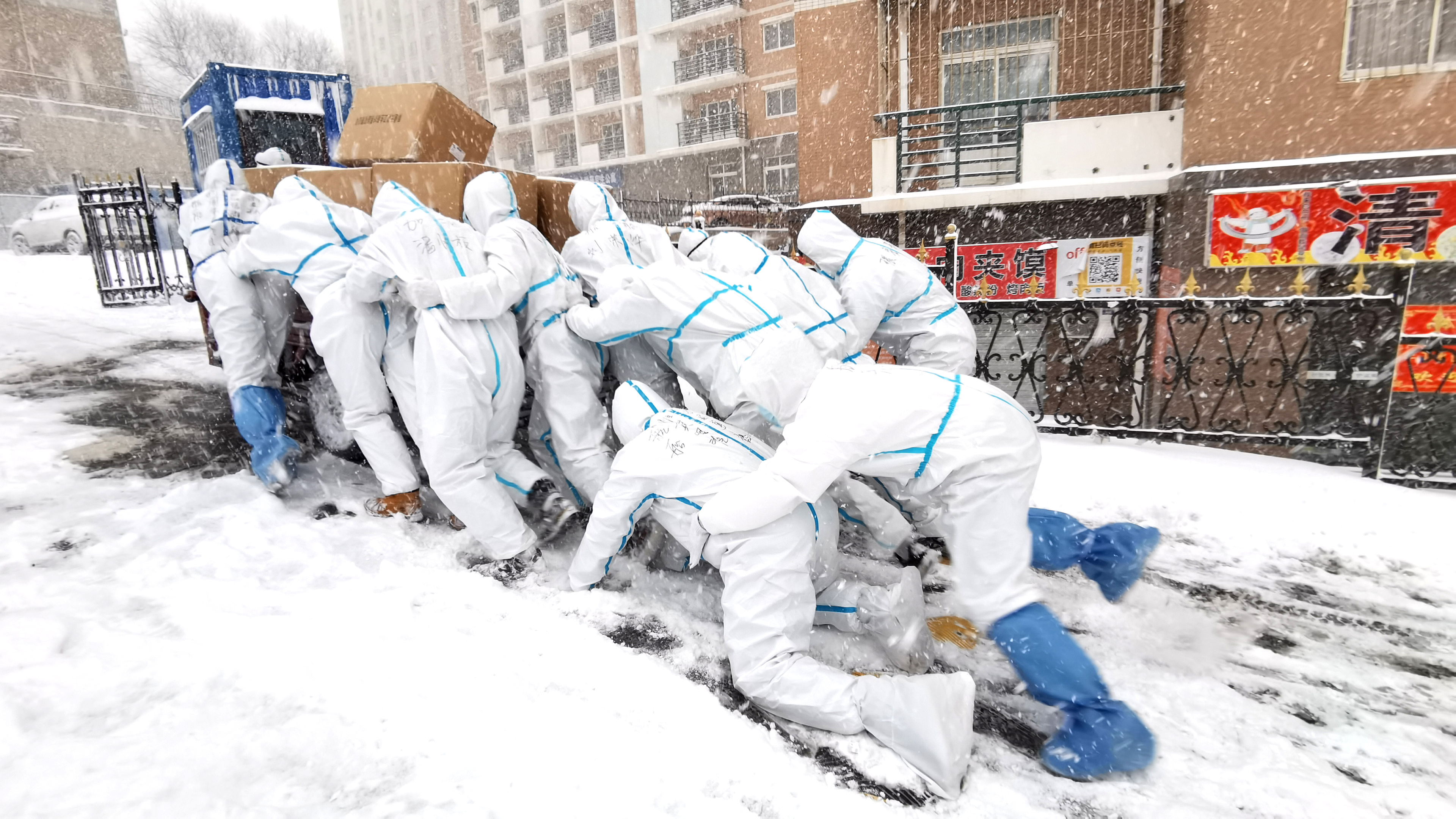 1月6日,大連海洋大學(xué)的志愿者們推著滿載的三輪車上坡,將物資送到學(xué)生宿舍。