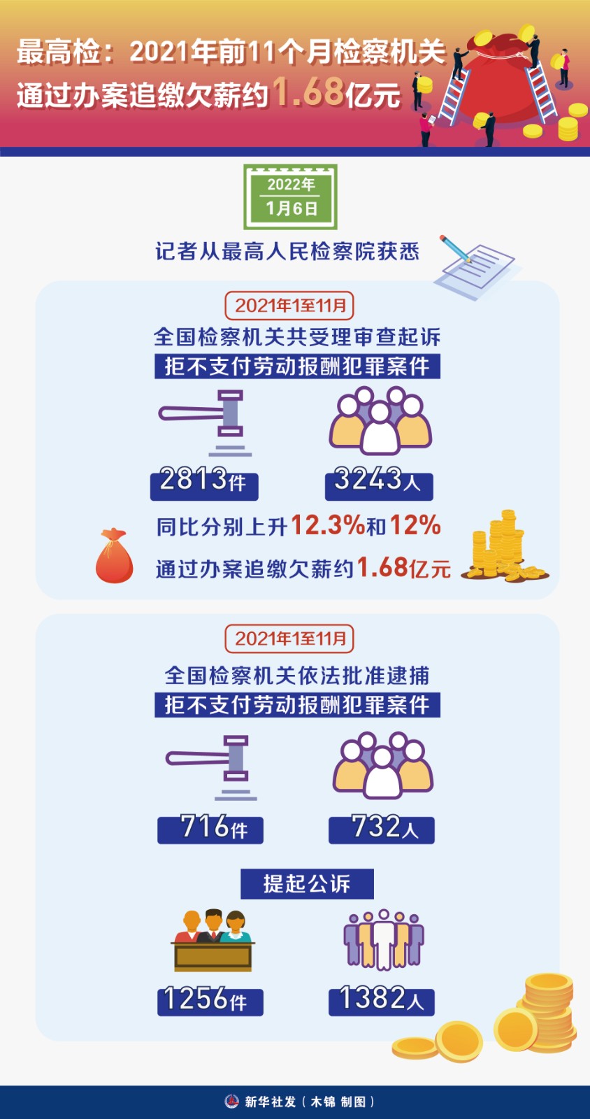 記者1月6日從最高人民檢察院獲悉,2021年1至11月,全國檢察機關共受理審查起訴拒不支付勞動報酬犯罪案件2813件3243人,同比分別上升12.3%和12%,通過辦案追繳欠薪約1.68億元。