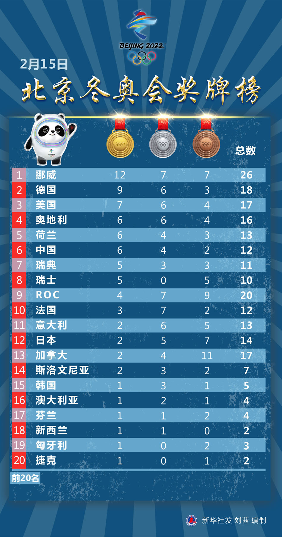 圖表:2月15日北京冬奧會獎牌榜