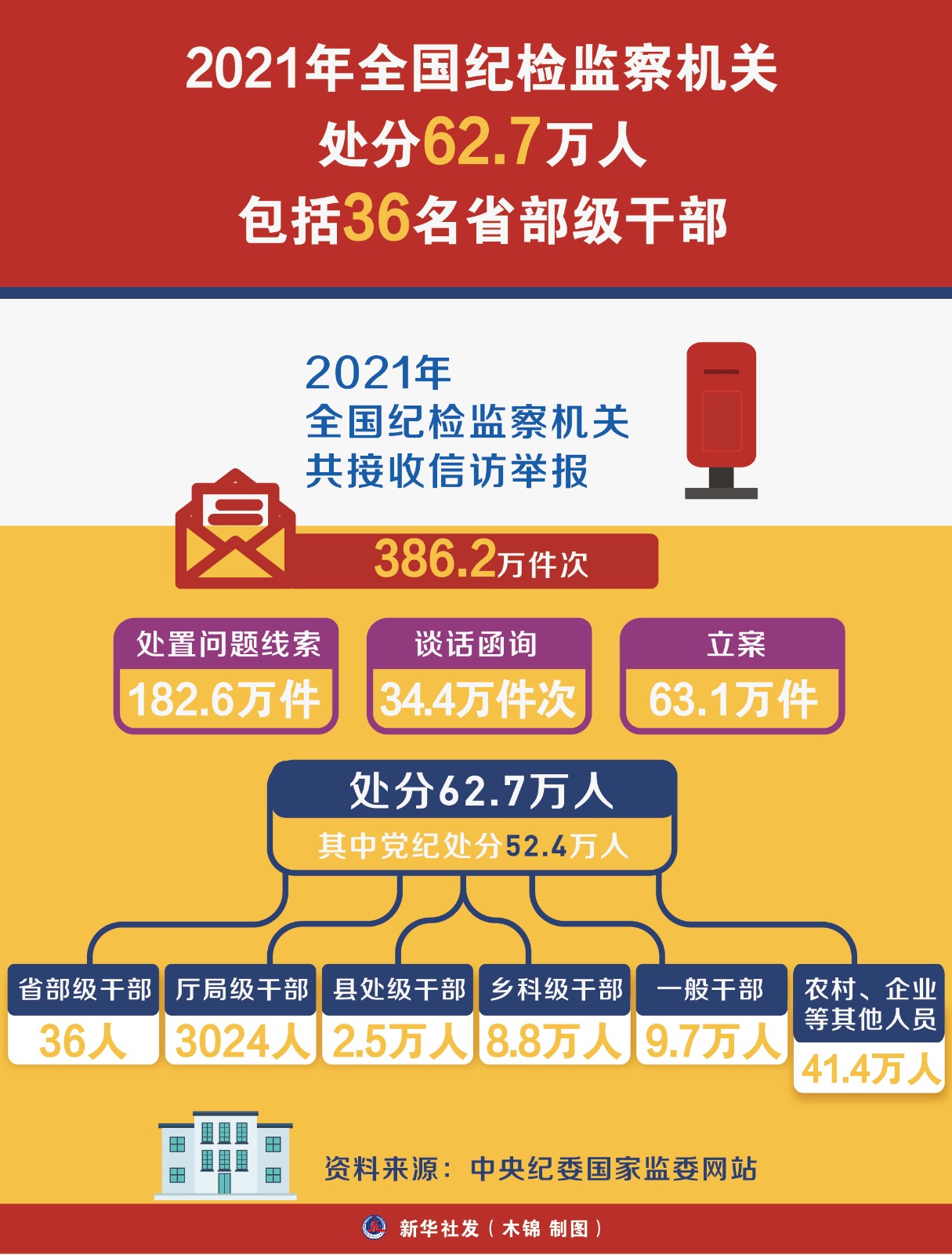 中央紀(jì)委國家監(jiān)委網(wǎng)站1月21日消息,中央紀(jì)委國家監(jiān)委通報2021年全國紀(jì)檢監(jiān)察機關(guān)監(jiān)督檢查審查調(diào)查情況。2021年,全國紀(jì)檢監(jiān)察機關(guān)共接收信訪舉報386.2萬件次,立案63.1萬件,處分62.7萬人,包括省部級干部36人,廳局級干部3024人。