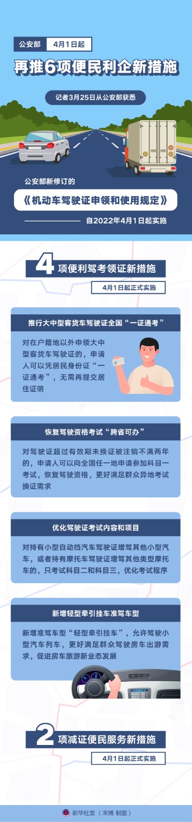 新華社記者3月25日從公安部獲悉,公安部新修訂的《機動車駕駛證申領(lǐng)和使用規(guī)定》自2022年4月1日起實施。新修訂的部門規(guī)章對公安部近年來已推出的交管改革措施予以固化,推進(jìn)改革成果制度化、法治化,并回應(yīng)群眾新要求新期待,再推出6項便民利企新措施。
