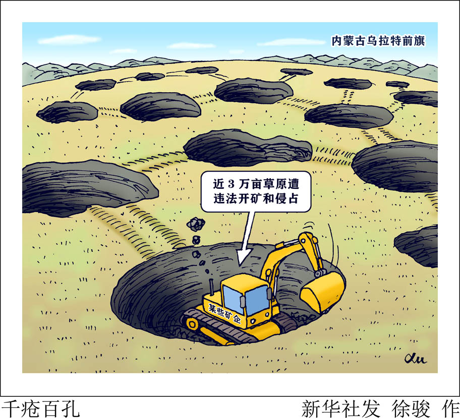 “新華視點”記者日前跟隨中央第三生態(tài)環(huán)境保護(hù)督察組督察發(fā)現(xiàn),內(nèi)蒙古自治區(qū)巴彥淖爾市烏拉特前旗礦山開采長期無序發(fā)展,近3萬畝草原遭違法開礦和侵占,使原本生態(tài)就脆弱的荒漠半荒漠草原遭受嚴(yán)重破壞。