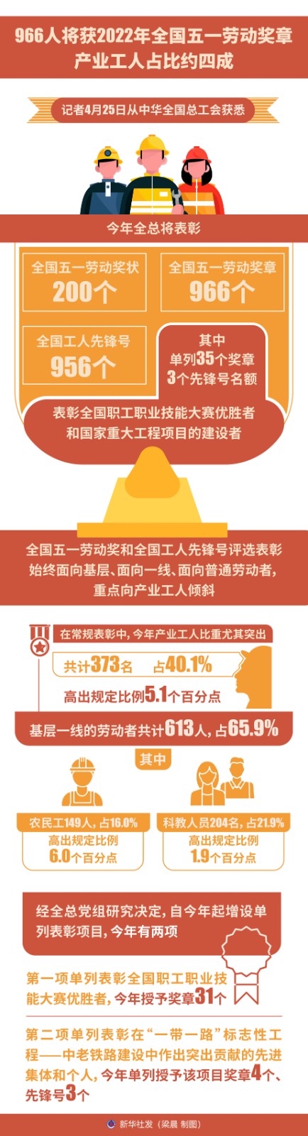 記者4月25日從中華全國總工會(huì)獲悉,今年全總將表彰全國五一勞動(dòng)獎(jiǎng)狀200個(gè)、全國五一勞動(dòng)獎(jiǎng)?wù)?66個(gè)、全國工人先鋒號(hào)956個(gè),其中單列35個(gè)獎(jiǎng)?wù)隆?個(gè)先鋒號(hào)名額,表彰全國職工職業(yè)技能大賽優(yōu)勝者和國家重大工程項(xiàng)目的建設(shè)者。
