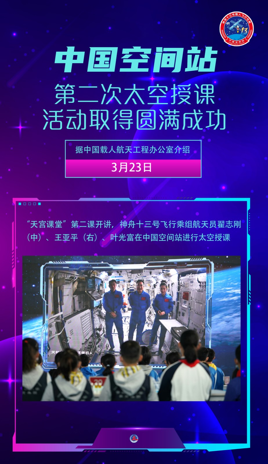 “天宮課堂”第二課3月23日開(kāi)講,“太空教師”翟志剛、王亞平、葉光富在中國(guó)空間站再次為廣大青少年帶來(lái)一堂精彩的太空科普課。