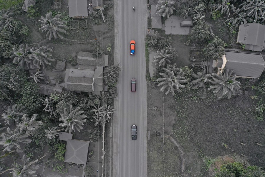 6月5日,菲律賓索索貢省的一個(gè)城鎮(zhèn)被布盧?;鹕絿姲l(fā)的火山灰覆蓋(無(wú)人機(jī)照片)。