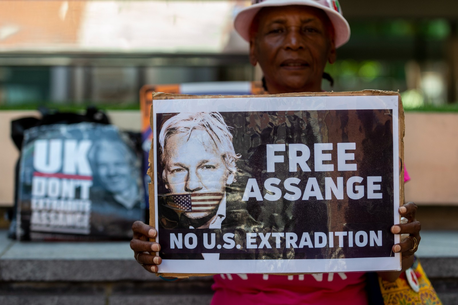 6月17日,一名女子在位于倫敦的英國(guó)內(nèi)政部大樓門前手舉寫有“釋放阿桑奇”的標(biāo)語(yǔ)牌。