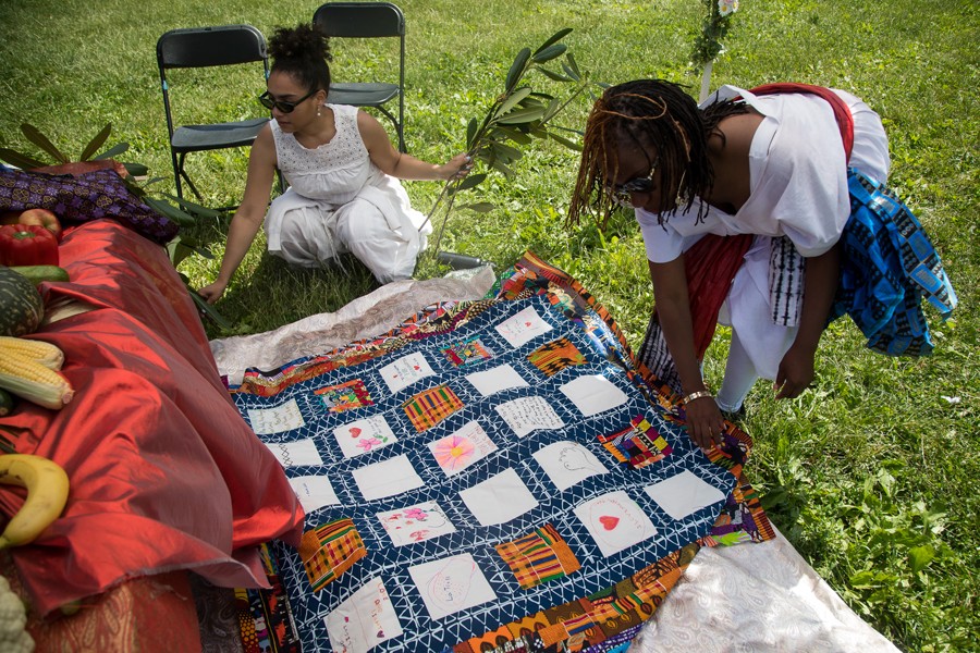 6月19日是美國的六月節(jié),也是紀念和慶祝美國黑人奴隸獲得解放的日子。在紐約展望公園六月節(jié)慶?;顒蝇F(xiàn)場的一個臨時帳篷里,一場悼念新冠逝者的拼布活動,氣氛肅穆,與周圍歡樂的氣氛顯得有些格格不入。拼布作品由許多小方塊織物縫合而成,每塊織物代表了活動參加者對死于新冠的親人的思念和追憶?;顒咏M織方鼓勵更多人帶來逝去親人曾穿過衣物的布片,以便縫制一塊更大的拼布。