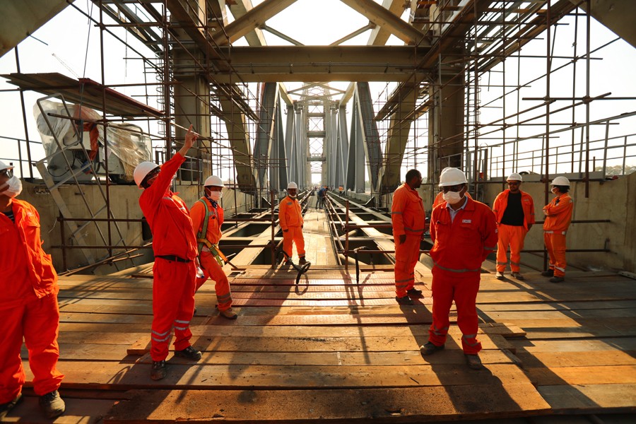 6月5日,在埃及伊斯梅利亞省,工人在蘇伊士運(yùn)河鐵路橋舊橋改造升級項(xiàng)目施工現(xiàn)場作業(yè)。