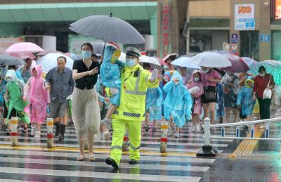 6月27日傍晚,湖北省荊門(mén)市公安局交警支隊(duì)民警在雨中,護(hù)送學(xué)生安全過(guò)馬路。當(dāng)天,荊門(mén)市發(fā)布暴雨橙色預(yù)警,荊門(mén)市公安局交警支隊(duì)民輔警提前到達(dá)各個(gè)護(hù)學(xué)崗點(diǎn),在雨中積極疏導(dǎo)交通,護(hù)送學(xué)生安全過(guò)馬路,確保學(xué)校門(mén)前及周邊道路交通安全暢通。