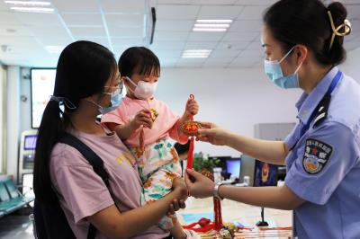 圖為6月3日,燈塔市公安局窗口服務(wù)大隊(duì)民警為前來(lái)辦理業(yè)務(wù)的群眾贈(zèng)送平安小禮物。