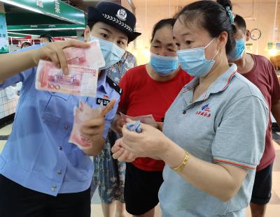 為提高居民識(shí)別假幣能力,連日來(lái),安徽省蕪湖市公安局繁昌分局開(kāi)展“打擊假幣犯罪,維護(hù)群眾財(cái)產(chǎn)安全”主題宣傳活動(dòng)。圖為6月21日,繁昌分局經(jīng)偵大隊(duì)和馬壩派出所民警在菜市場(chǎng)向群眾宣傳如何識(shí)別假幣。