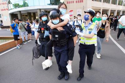 高考期間,江蘇省宜興市公安局多部門(mén)密切配合高效服務(wù),民警們盡職盡責(zé)值守在各考點(diǎn),為考生營(yíng)造安心、舒心、暖心的考試環(huán)境。圖為6月8日,執(zhí)勤民警協(xié)助一位腳扭傷的考生離開(kāi)考場(chǎng)。