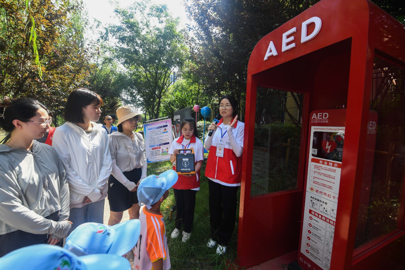 6月27日,龍泉街道紅十字會(huì)志愿者為轄區(qū)居民們介紹自動(dòng)體外除顫器(AED)的使用知識(shí)。