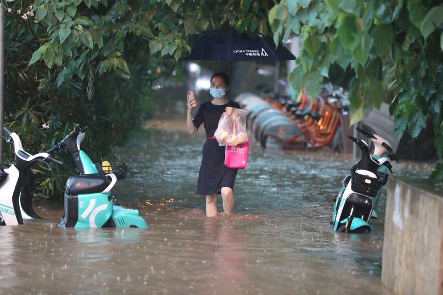 7月5日,市民在南寧街頭涉水前行。