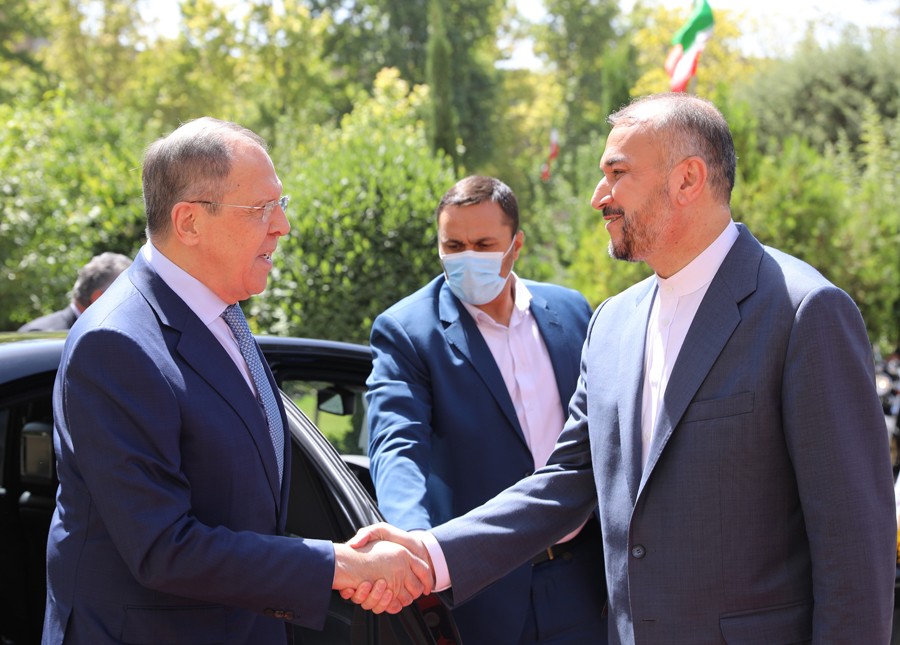 6月23日,伊朗外長阿卜杜拉希揚(yáng)(右)在德黑蘭迎接俄羅斯外長拉夫羅夫。