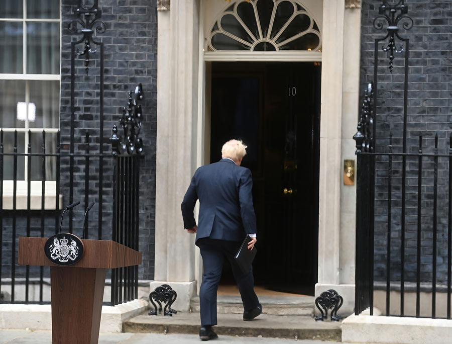 7月7日,英國(guó)首相鮑里斯·約翰遜在倫敦唐寧街10號(hào)門前發(fā)表講話后返回室內(nèi)。