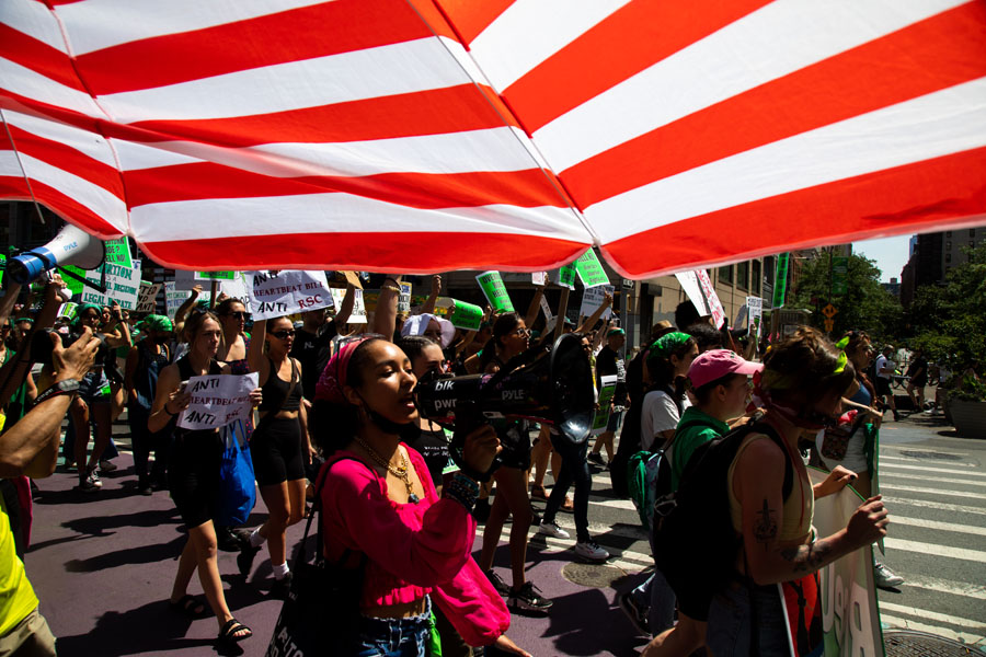 當(dāng)日,墮胎權(quán)支持者在美國紐約舉行示威游行。美國聯(lián)邦最高法院6月24日推翻近半個(gè)世紀(jì)前在聯(lián)邦層面確立墮胎權(quán)的判例“羅訴韋德案”,取消對女性墮胎權(quán)的憲法保護(hù),引發(fā)廣泛爭議。