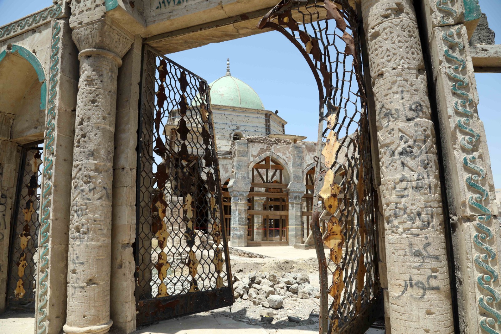 這是7月3日在伊拉克摩蘇爾老城拍攝的努里清真寺大門。