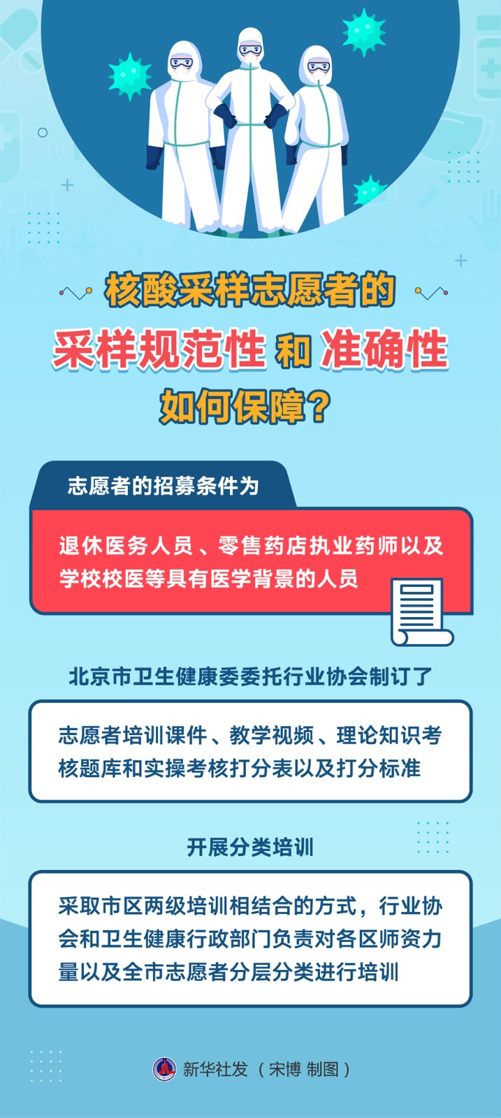 李昂表示,為確保志愿者采樣的規(guī)范性和準(zhǔn)確性,北京市衛(wèi)生健康委委托行業(yè)協(xié)會制訂了志愿者培訓(xùn)課件、教學(xué)視頻、理論知識考核題庫和實(shí)操考核打分表以及打分標(biāo)準(zhǔn),開展分類培訓(xùn),采取市區(qū)兩級培訓(xùn)相結(jié)合的方式,行業(yè)協(xié)會和衛(wèi)生健康行政部門負(fù)責(zé)對各區(qū)師資力量以及全市志愿者分層分類進(jìn)行培訓(xùn)。