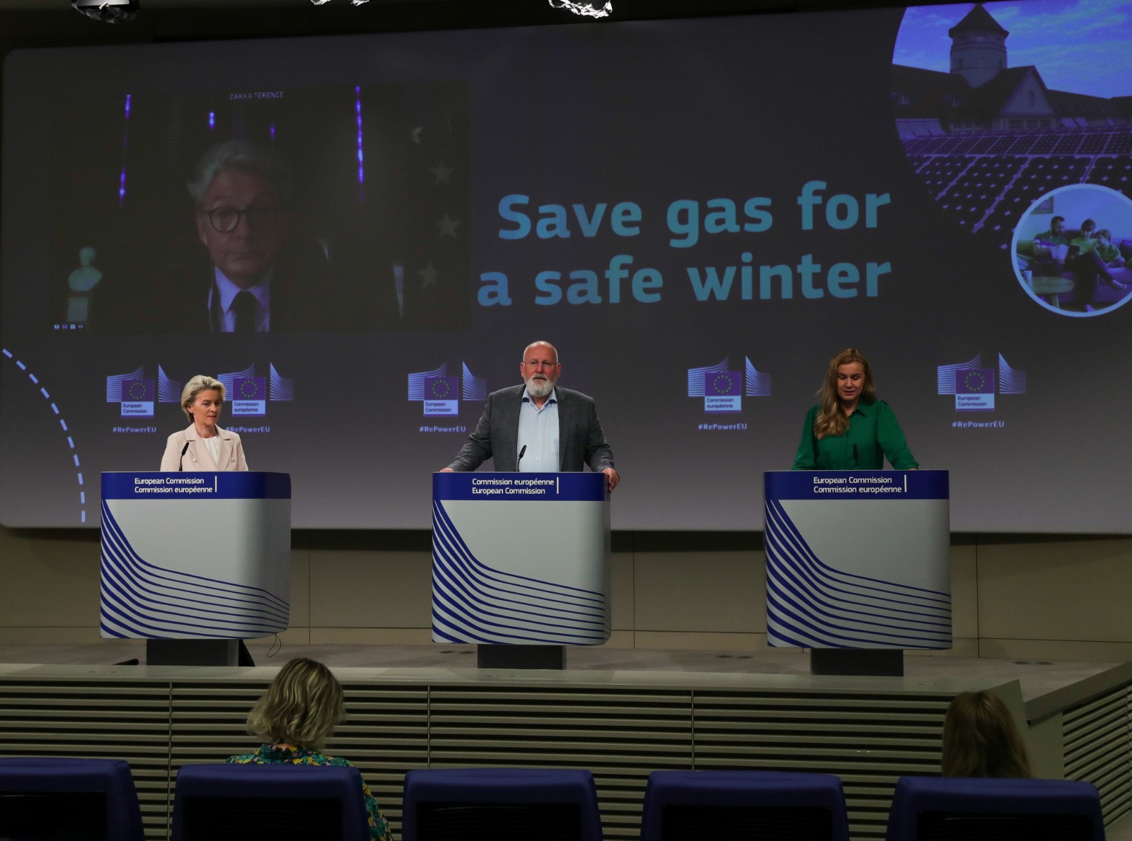 7月20日,在比利時布魯塞爾,歐盟委員會主席馮德萊恩(左一)、歐盟委員會執(zhí)行副主席蒂默曼斯(右二)、負責內(nèi)部市場的歐盟委員蒂埃里·布雷東(視頻參會)、負責能源事務的歐盟委員卡德麗·西姆松(右一)出席新聞發(fā)布會。