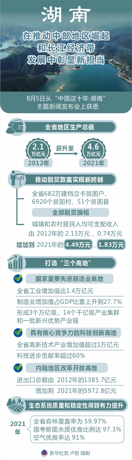 記者從8月5日舉行的“中國這十年·湖南”主題新聞發(fā)布會上獲悉,黨的十八大以來,湖南努力在推動高質(zhì)量發(fā)展上闖出新路子,在構(gòu)建新發(fā)展格局中展現(xiàn)新作為,在推動中部地區(qū)崛起和長江經(jīng)濟(jì)帶發(fā)展中彰顯新?lián)?dāng),奮力譜寫新時(shí)代堅(jiān)持和發(fā)展中國特色社會主義的湖南新篇章。