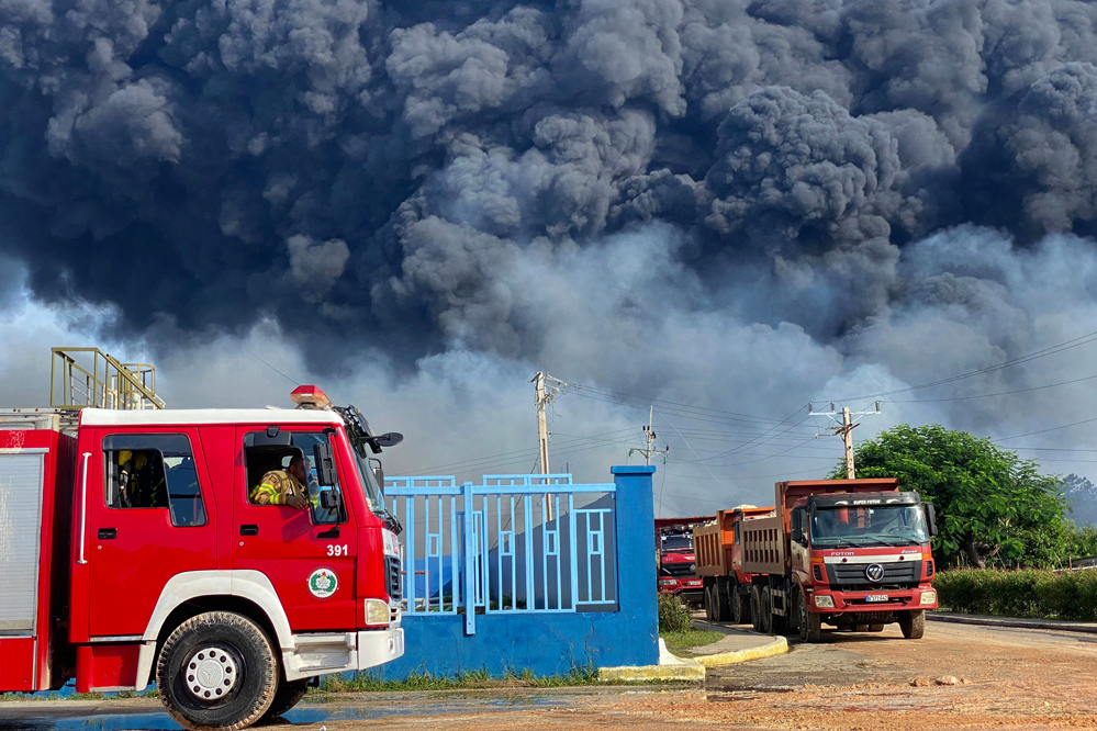 8月8日,在古巴馬坦薩斯省,救援車(chē)輛停在火災(zāi)現(xiàn)場(chǎng)附近。