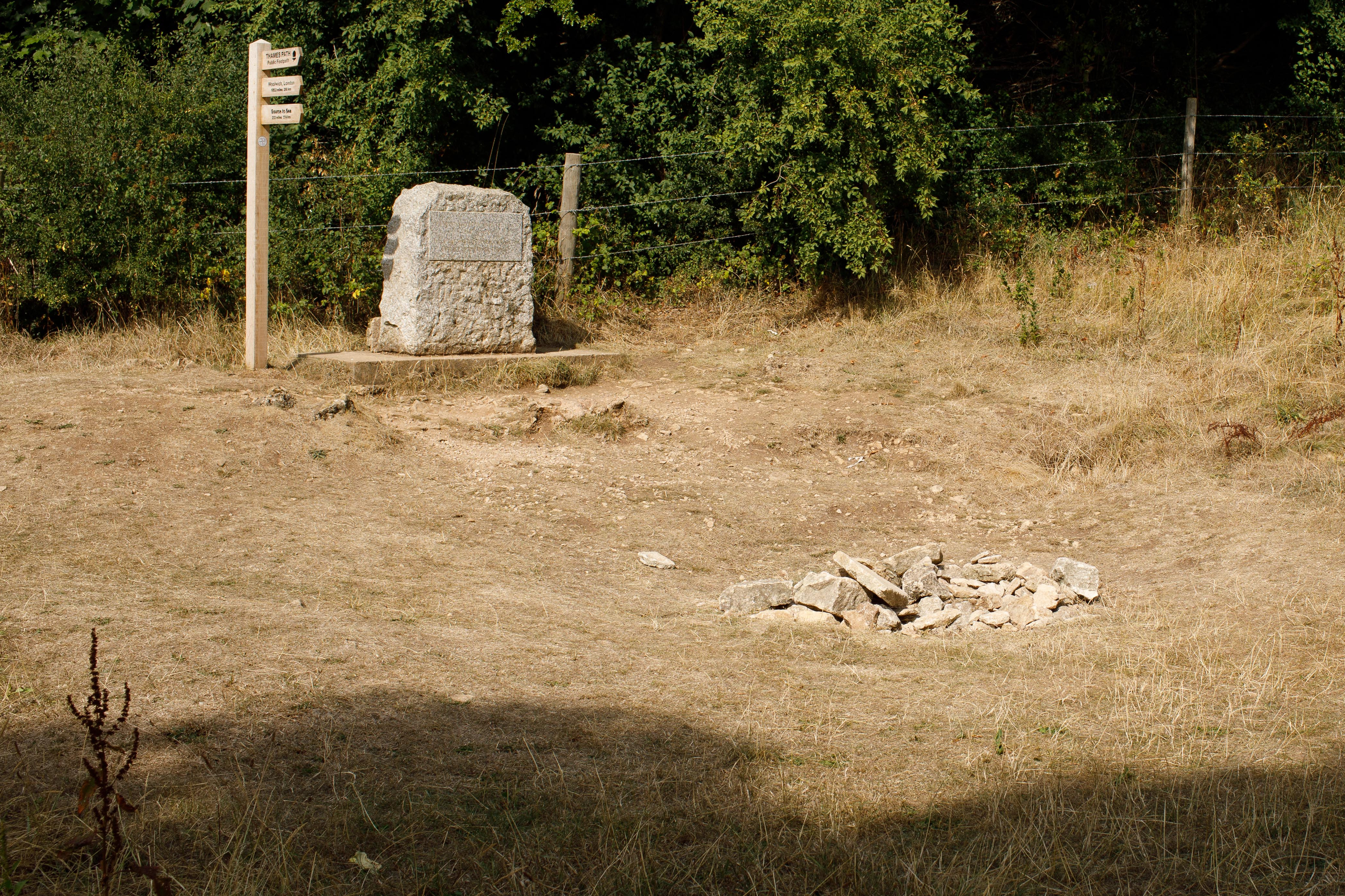 這是8月14日在英國賽倫塞斯特附近拍攝的干涸的泰晤士河發(fā)源地和一塊寫有“泰晤士河起點”的石碑。