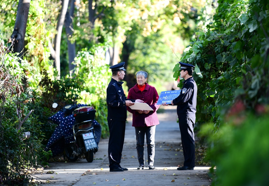 10月9日,安徽省阜南縣公安局城西派出所民警在轄區(qū)一居民家門(mén)口宣講防范網(wǎng)絡(luò)電信詐騙和養(yǎng)老詐騙常識(shí)。