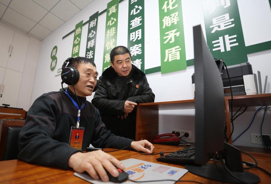 圖為 1月4日,法院工作人員與人民調解員對一起民間借貸糾紛案進行線上調解。