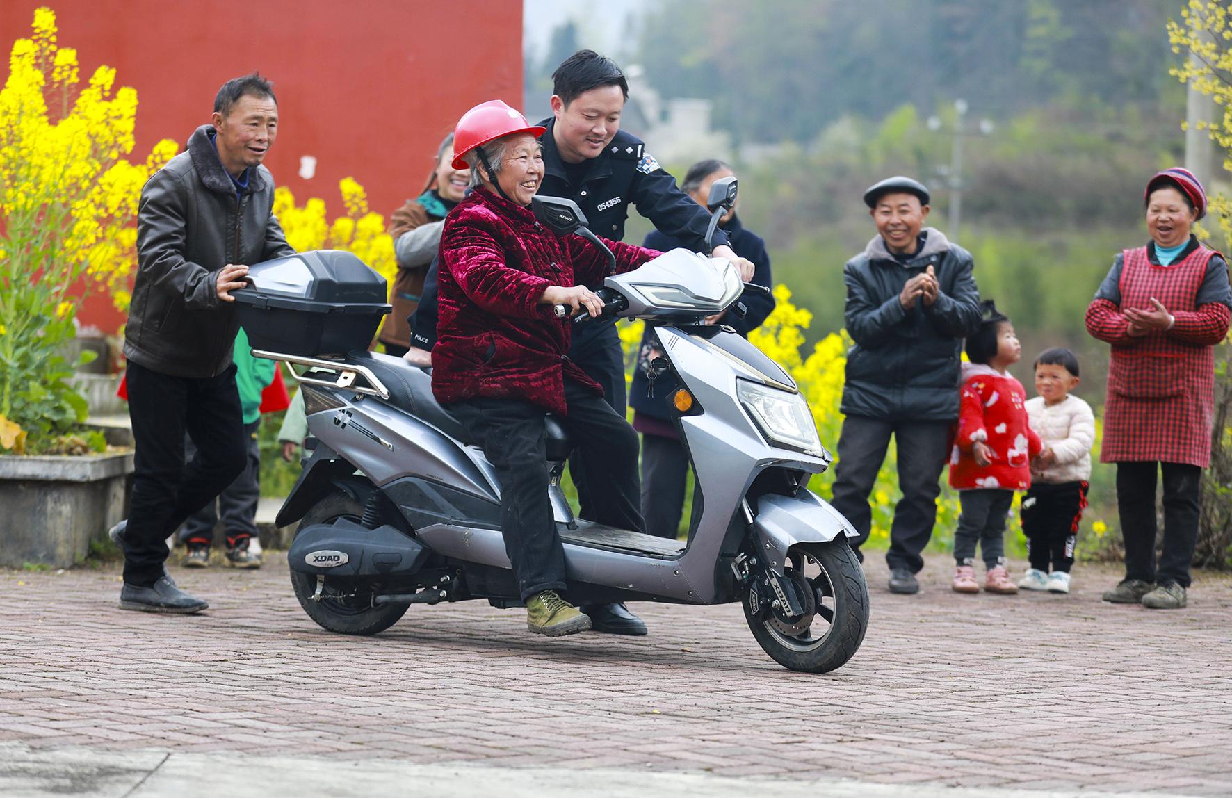 3月26日,貴州省黔西市公安局金蘭派出所民警在清華村院壩里,指導村民練習騎車技術,講解道路交通安全知識。